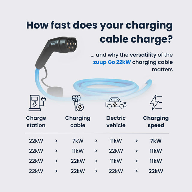 zuup Go charge cables support charging speeds of up to 22kW, delivering up to ~130km of range per hour when connected to a compatible three-phase power source.